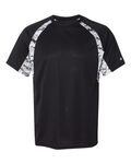 Badger B-Dri Digital Camo Hook T-Shirt. 100% polyester moisture management/antimicrobial performance fabric. Sublimated digital side & sleeve panel inserts. Self-fabric collar, double-needle hem. Badger heat seal logo on left sleeve.